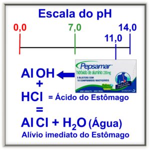 Quando estamos com queimação no estômago, colocamos uma Pastilha de PEPSAMAR na boca, e ao entrar em contato com a nossa saliva transforma em uma Solução Aquosa de pH igual a 11, desta forma, temos o alívio imediato da queimação no estômago.